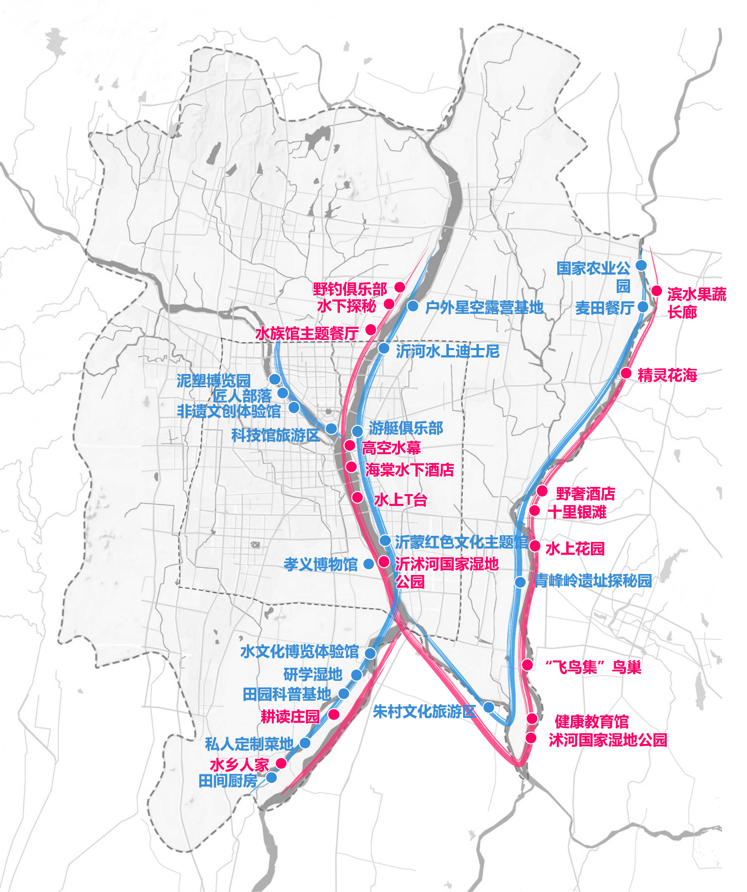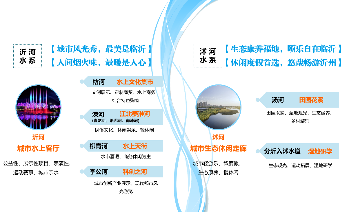 2.“水+旅游”專題——從“河流振興、因水而親、城鄉(xiāng)共榮”的角度出發(fā),通過對主要水系河流進行發(fā)展定位,完善河流旅游產(chǎn)品和項目業(yè)態(tài),以主題游線設(shè)計、沂水夜游、其他特色項目等為吸引點,優(yōu)化提升臨沂市水上旅游品質(zhì),樹立臨沂北方水城的品牌形象與市場競爭力。