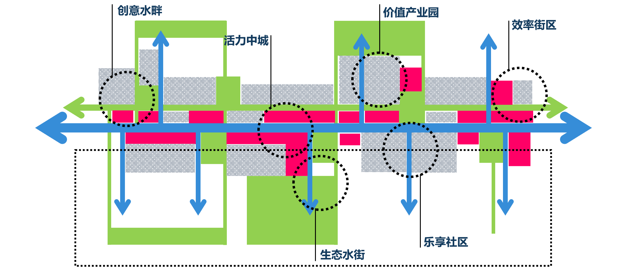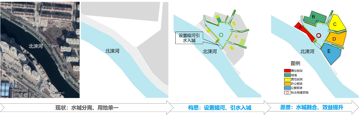 5.“水+用地”專題——針對水上項目周邊用地發(fā)展面臨的商業(yè)設(shè)施缺乏、用地布局單一等問題,提出適當增加濱河休閑商業(yè)用地、優(yōu)化土地利用布局,濱水建筑天際線控制等發(fā)展思路,真正發(fā)揮濱水用地的經(jīng)濟效益和社會價值。