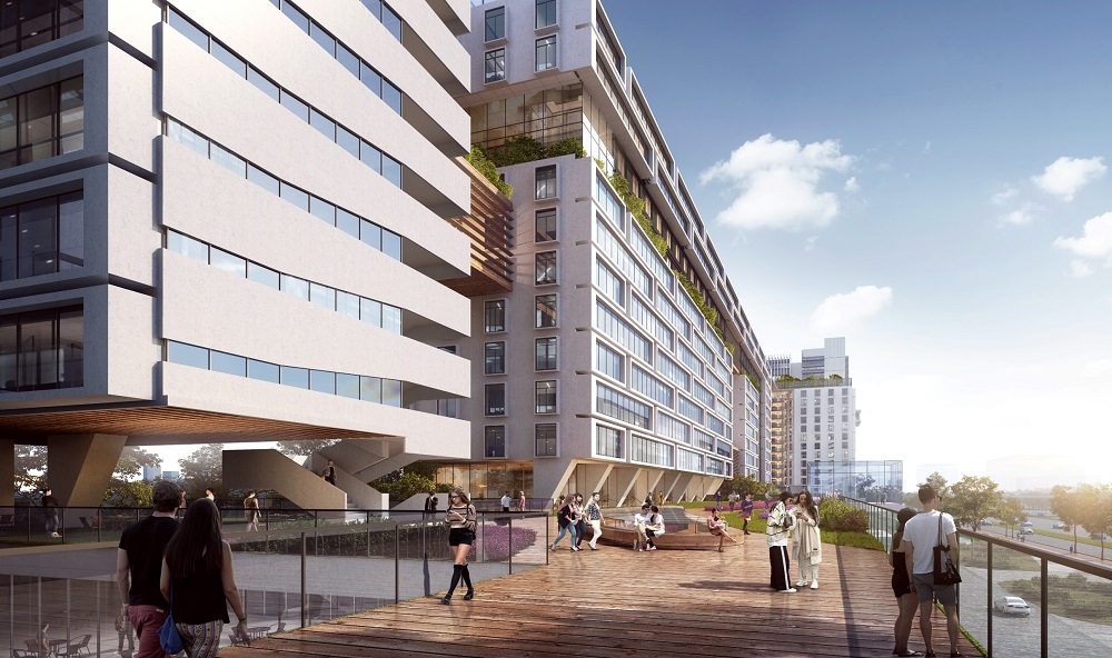 活力天街場(chǎng)景——構(gòu)思利用300余米長(zhǎng)的架空平臺(tái)加上400余米長(zhǎng)起伏的景觀步道,形成總長(zhǎng)800米、貫穿整個(gè)基地的帶狀連續(xù)步行空間(天街),避開喧囂,開放視野,一路通達(dá),體驗(yàn)活力。