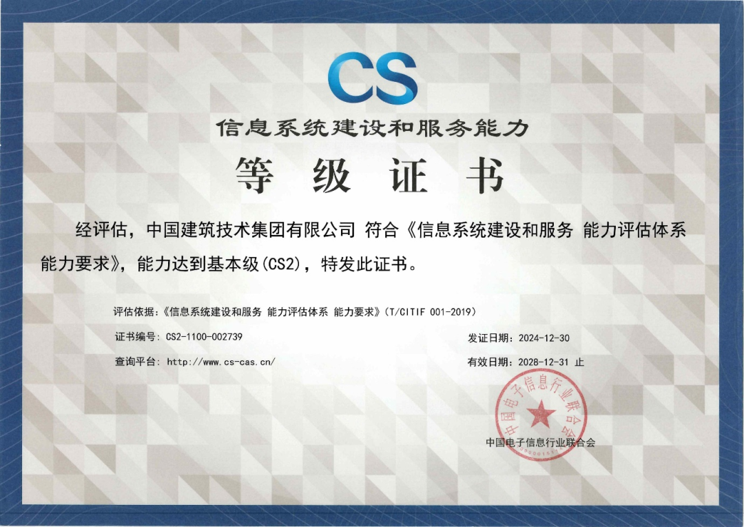 近日,中國建技成功通過中國電子信息行業(yè)聯(lián)合會(huì)評審,榮獲CS2信息系統(tǒng)建設(shè)和服務(wù)能力認(rèn)證。這是中國建技繼質(zhì)量、環(huán)境、職業(yè)健康安全、信息技術(shù)服務(wù)、信息安全管理體系認(rèn)證后,獲得的又一項(xiàng)國家級權(quán)威認(rèn)證。