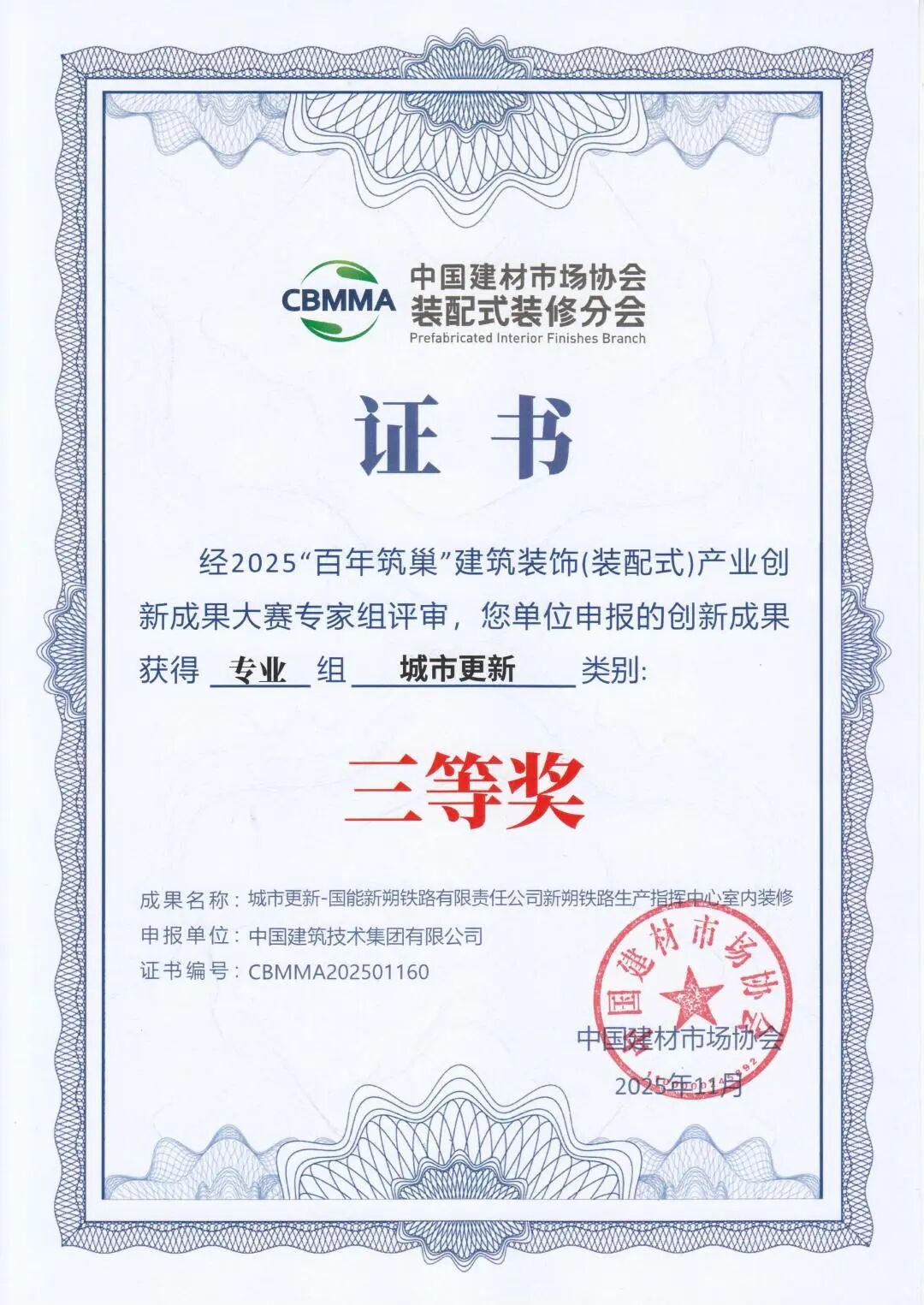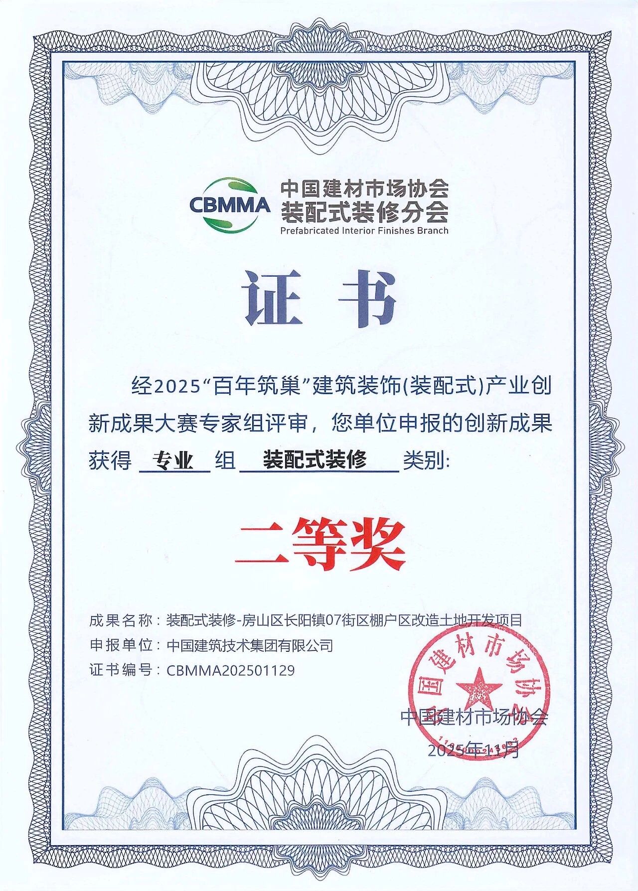 11月13日,由中國建材市場協(xié)會、中國建材市場協(xié)會裝配式裝修分會主辦的2025首屆裝配式裝修產(chǎn)業(yè)大會在浙江海寧會展中心舉行。中國建技所屬三個(gè)項(xiàng)目在大會同期舉辦的2025“百年筑巢”建筑裝飾(裝配式)產(chǎn)業(yè)創(chuàng)新成果大賽中獲獎。