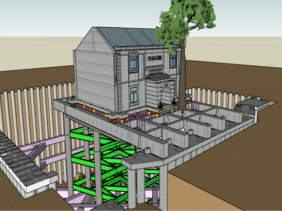 該建筑原為公安部辦公樓,始建于民國(guó)時(shí)期,是西城區(qū)重點(diǎn)保護(hù)文物。建筑占地面積約400平方米,東西長(zhǎng)約15米,南北長(zhǎng)約14米,地上兩層,地下基坑深度達(dá)20米。在該地塊開發(fā)過程中,需在建筑周邊及下方進(jìn)行基坑開挖,同時(shí)西側(cè)地鐵19號(hào)線太平橋站B口的施工也在同步進(jìn)行。為確保歷史建筑的安全,項(xiàng)目團(tuán)隊(duì)對(duì)其進(jìn)行了原址托換處理。