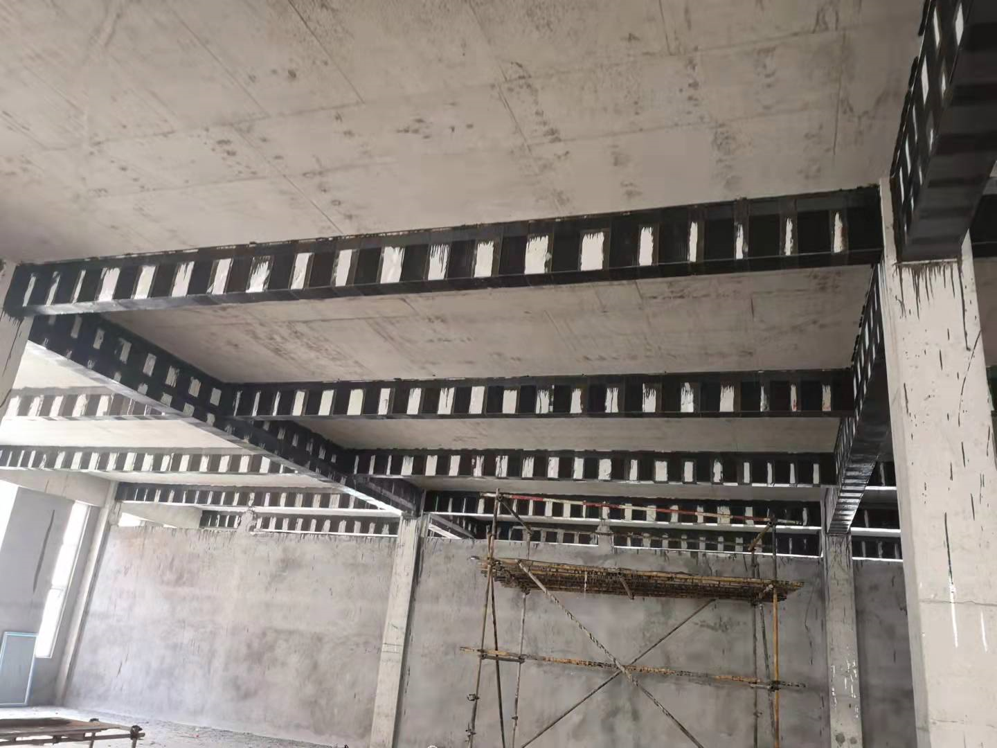 梁粘碳纖維或粘鋼:由于廠房急于交付使用,經(jīng)設(shè)計(jì)優(yōu)化,在滿足原設(shè)計(jì)荷載的情況下采用施工迅速更便捷且占用空間最小的粘鋼和粘碳纖維工藝施工。節(jié)省了約1/4的工期