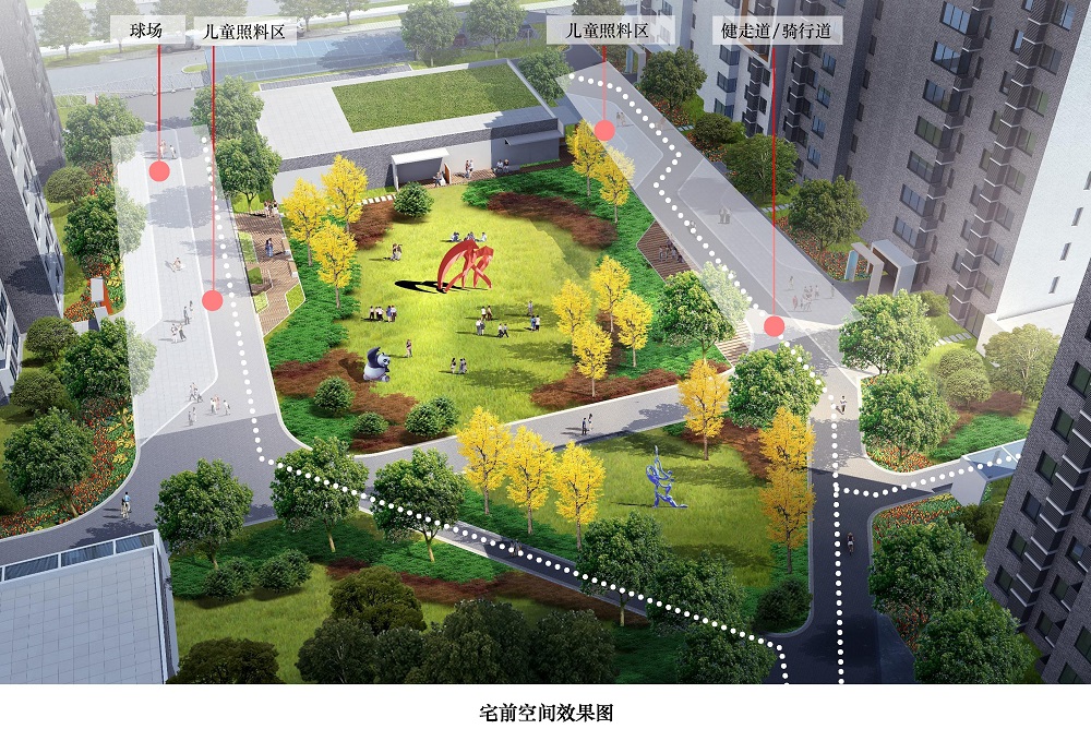 利用宅前消防登高場地規(guī)劃打球、健走、騎行和兒童照料等內(nèi)容,將宅前空間作為單元住戶的交往活力場所?;顒訄龅赝鈹U,結(jié)合綠化布置休閑座椅、花池廊架和文化藝術(shù)裝置,合理布局自行車棚、信報箱、垃圾收集箱和配電室等項設(shè)施。單元樓門設(shè)置入口標(biāo)識和門禁,居民活動也能對樓宇安全發(fā)揮良好的監(jiān)控作用。