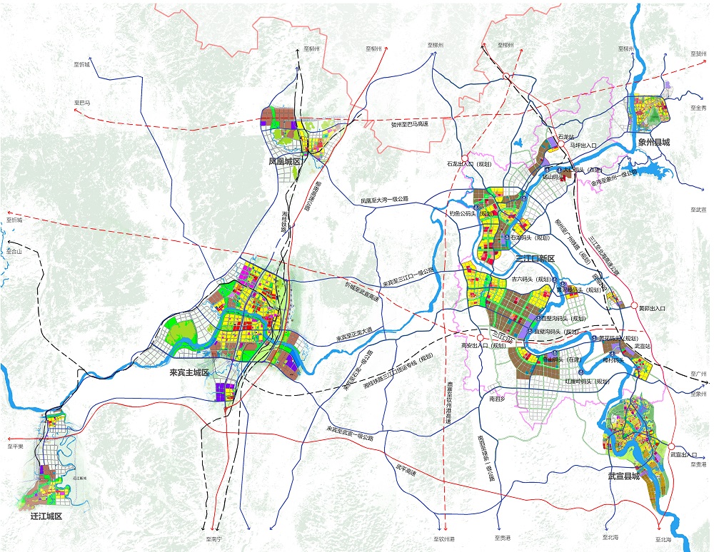 區(qū)域一體化發(fā)展規(guī)劃——三江口新區(qū)未來將與來賓主城區(qū)形成來賓市“雙核驅(qū)動”的發(fā)展新格局。三江口新區(qū)作為產(chǎn)業(yè)、經(jīng)濟(jì)、商務(wù)中心,主城區(qū)作為行政、文化、科教、生活中心,通過區(qū)域間半小時快速交通體系形成產(chǎn)業(yè)協(xié)作、資源共享、基礎(chǔ)共建、功能互補的“來賓雙子城”。