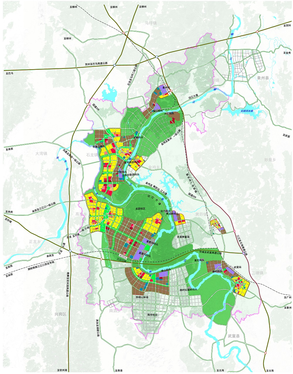 高效綜合交通系統(tǒng)規(guī)劃——以區(qū)域性交通互聯(lián)互通為突破點,形成以港口、鐵路、公路為核心的多式聯(lián)運對外綜合交通體系,強(qiáng)化以港口碼頭為中心建設(shè)通往柳州、河池等周邊城市以及通往粵港澳大灣區(qū)城市的黃金水道;重點推進(jìn)三江口新區(qū)產(chǎn)業(yè)組團(tuán)與國道209、國道355等區(qū)域性交通干道的銜接;完善以港區(qū)港口為支點的港產(chǎn)城融合發(fā)展體系:加快石龍碼頭、直壁溝碼頭、黃泥嶺碼頭及其配套設(shè)施的建設(shè),以港口為依托,完善集疏運體系,促進(jìn)港口與腹地經(jīng)濟(jì)良性循環(huán)發(fā)展,驅(qū)動新區(qū)從“碼頭經(jīng)濟(jì)”走向港產(chǎn)城融合發(fā)展。