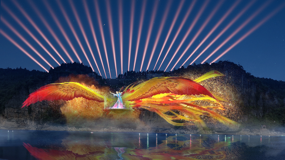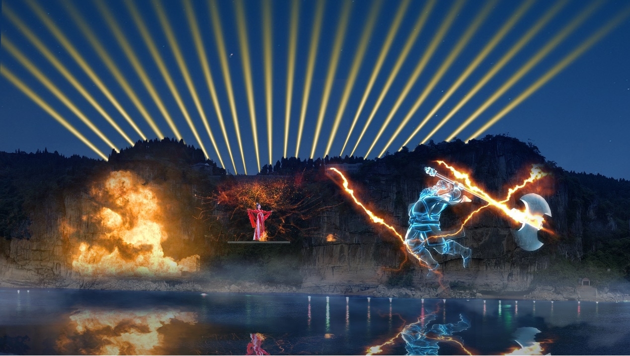 崖壁5D燈光秀尤為新穎,采用“崖壁投影+舞臺演繹”的方式,以兩側(cè)崖壁為投影載體,中間布置小舞臺配合燈光矩陣,將辛女與盤瓠的凄美愛情故事和妖怪來襲國破山河場面,將軍點兵出征的戲劇場面演繹得活靈活現(xiàn)。